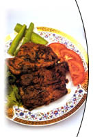Both sides of chunks of chicken are grilled and all the meat is put into a saucepan. Three finely cut onions and small hot peppers are fried in oil and added to the saucepan and cooked for about 1.5 hours on low fire in enough water to cover them all together with chopped parsleys, salt and spices to taste.