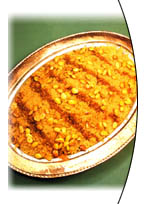 300 grammes of cooking fat is heated in a saucepan and 600 grammes of semolina is slowly added to it while stirring at the same time. Peeled almonds are added to the mixture. When the almonds are roasted, half a litre of boiling water and half a litre of boiling milk is added and mixed thoroughly. It is left to mature for about fifteen minutes and powdered sugar and rose attar is sprinkled on it before serving.
