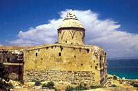 kdamar Church (Akdamar Island - Gevaş): It is 55 km away from Van, and after 20 minutes of motor voyage from the wharf on Van -Tatvan road, you can reach to the church. It is constructed between 915 and 921 by Vasparakan Ruler, I. Gagig. The chruch's, which is constructed with trefoil plan, yellowish cut stones composed mason is serving a magnificent masonry.